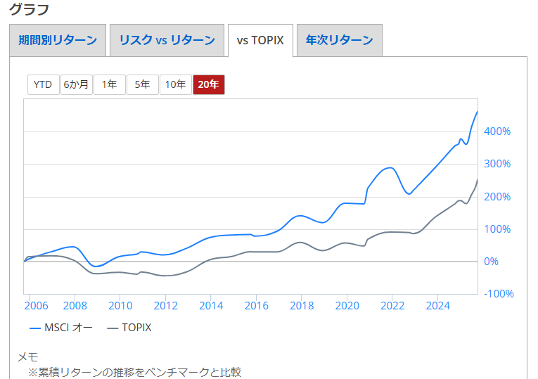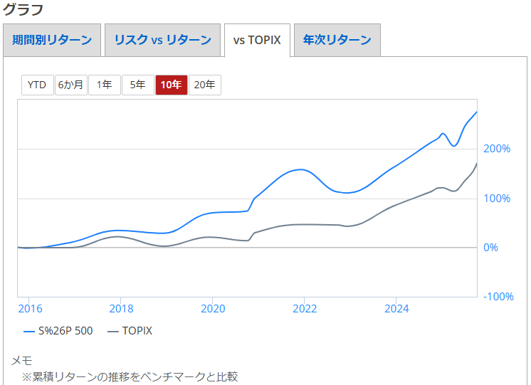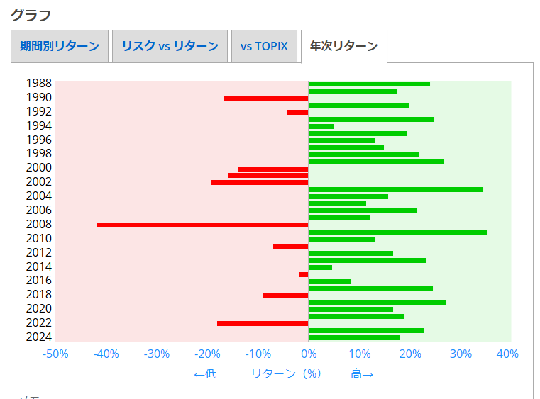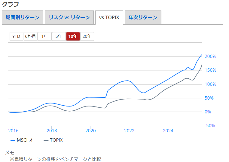 比較対象の日本株のインデックス「TOPIX」もここ数年調子が良いので成績は良いですね。