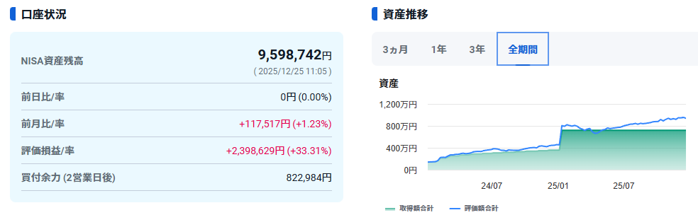 私は「SBI証券」で投資をしていますので、「SBI証券」のNISA画面も載せておきます。(2025.12.25時点)