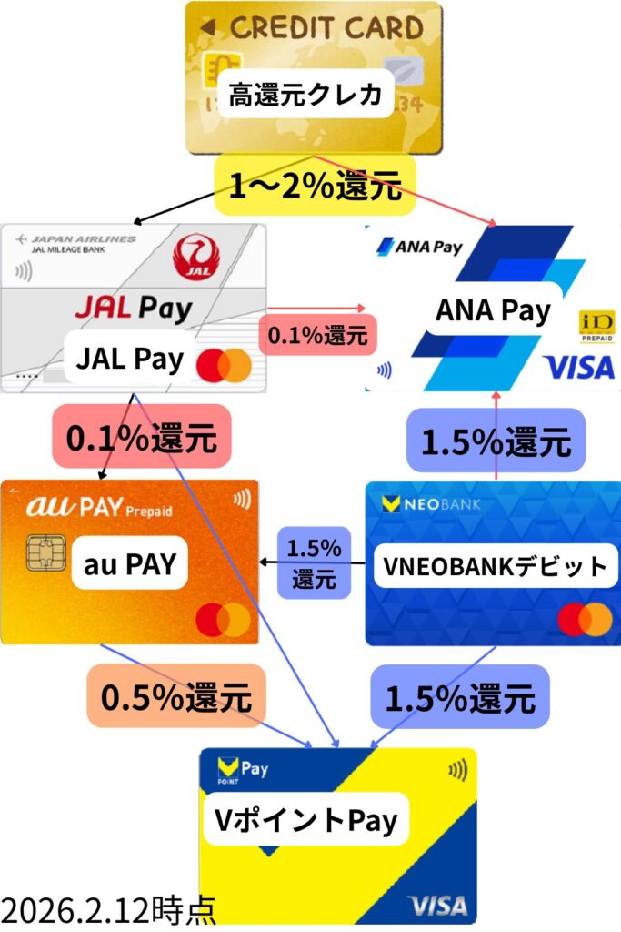 - VNEOBANKデビット(1.5%)→auPAY(0.5%)→VポイントPay(計2.5%還元)