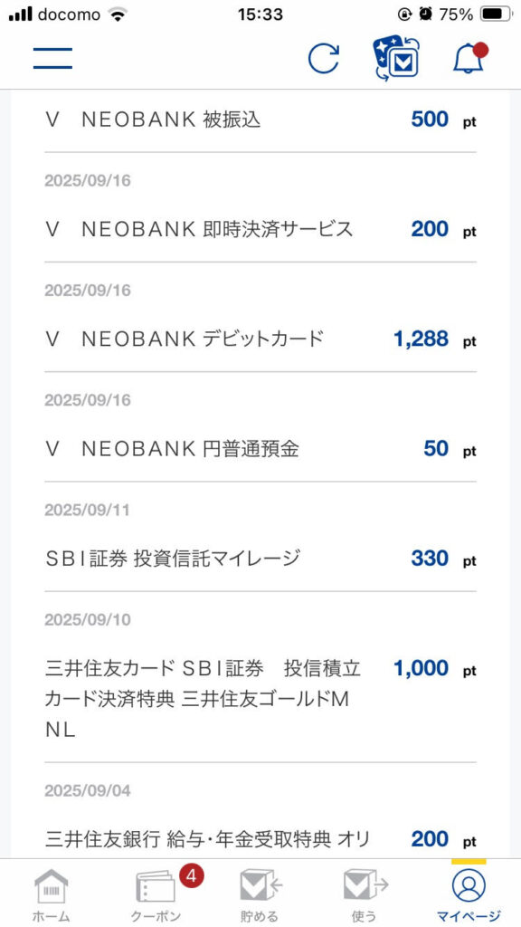 メインの支払い手段が「三井住友カードNLゴールド」と「VNEOBANKデビット」なら月平均で2,000ポイントぐらいは狙えます。(VNEOBANKやSBI証券のポイントがあれば3,000ポイント以上も狙えます)